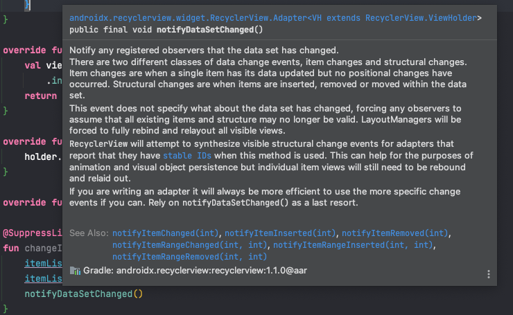 notifyDataSetChanged 외 다른 메서드들도 존재한다는 걸 알려주고 있습니다.