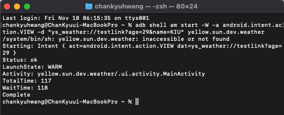 adb shell am start -W -a android.intent.action.VIEW -d "ys_weather://testlink?age=29&name=KIU" yellow.sun.dev.weather