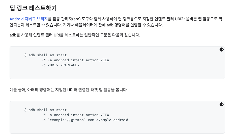 adb 명령어를 통하여 딥링크에 대한 테스트 진행을 소개하고 있습니다.