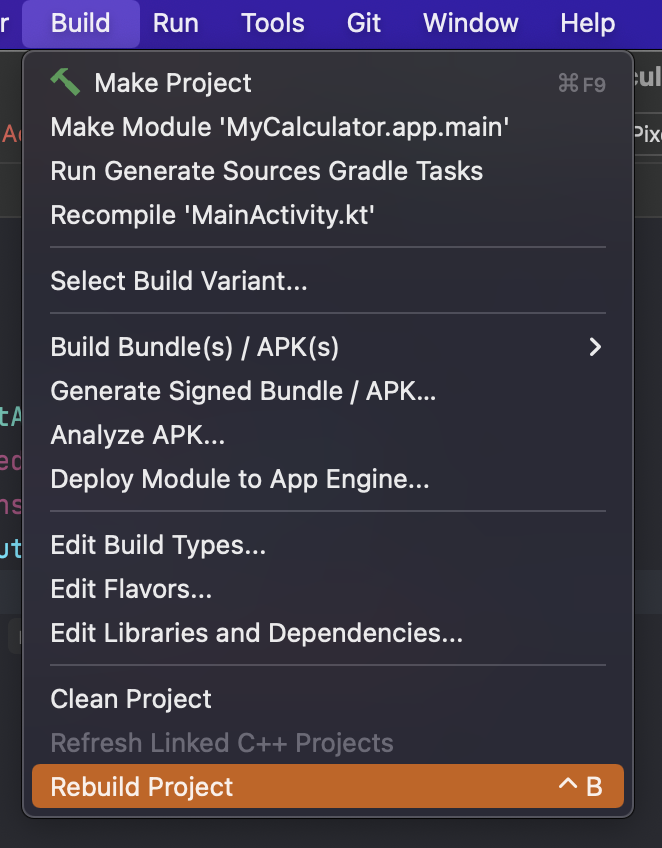안드로이드 스튜디오 상단 툴에 보시면 'Build' > 'Rebuild Project' / 'Clean Project'를