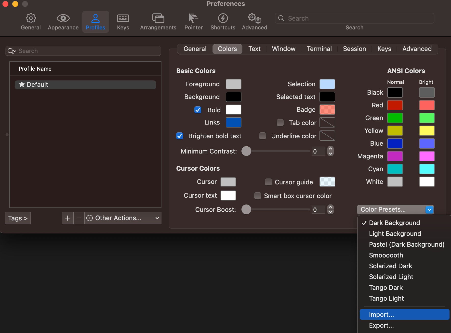 Profiles >> Colors 탭에 진입하여 테마 Import를 눌러