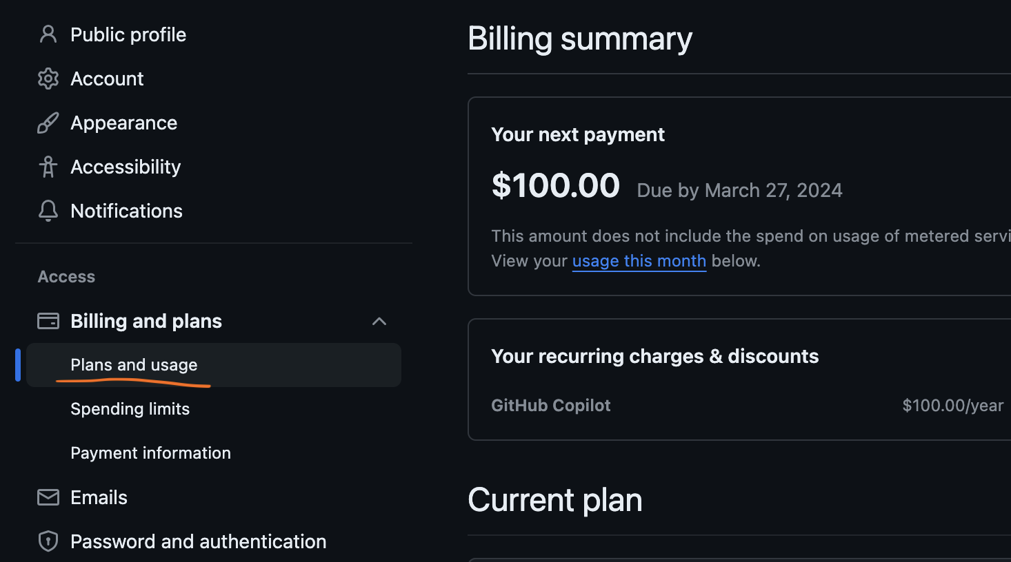 진입하여 좌측 'Access'의 하단 메뉴 중 'Plans and usage'에 진입하여