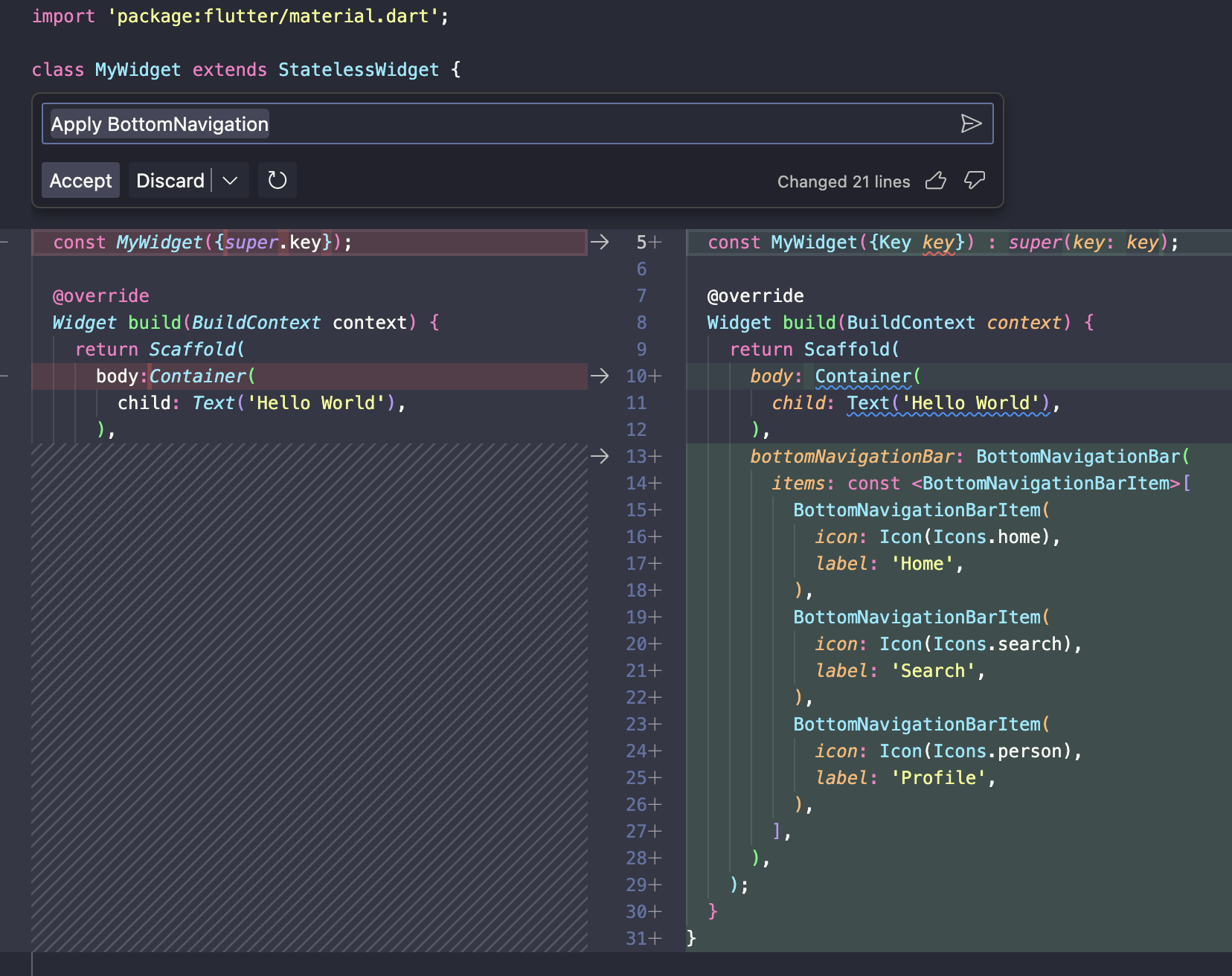 위와 같이 제안해 준 내용을 'Accept'하여 소스코드 안에 바로 적용이 가능합니다.