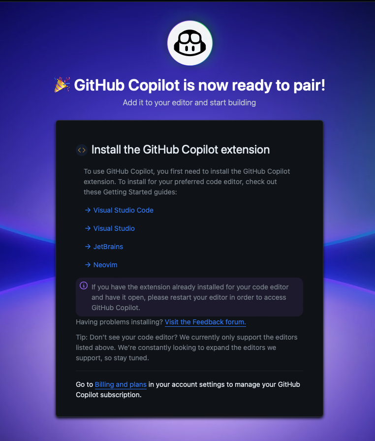 카드 정보와 몇 가지 동의사항 진행 후 GitHub Copilot 사용 가능 하다는