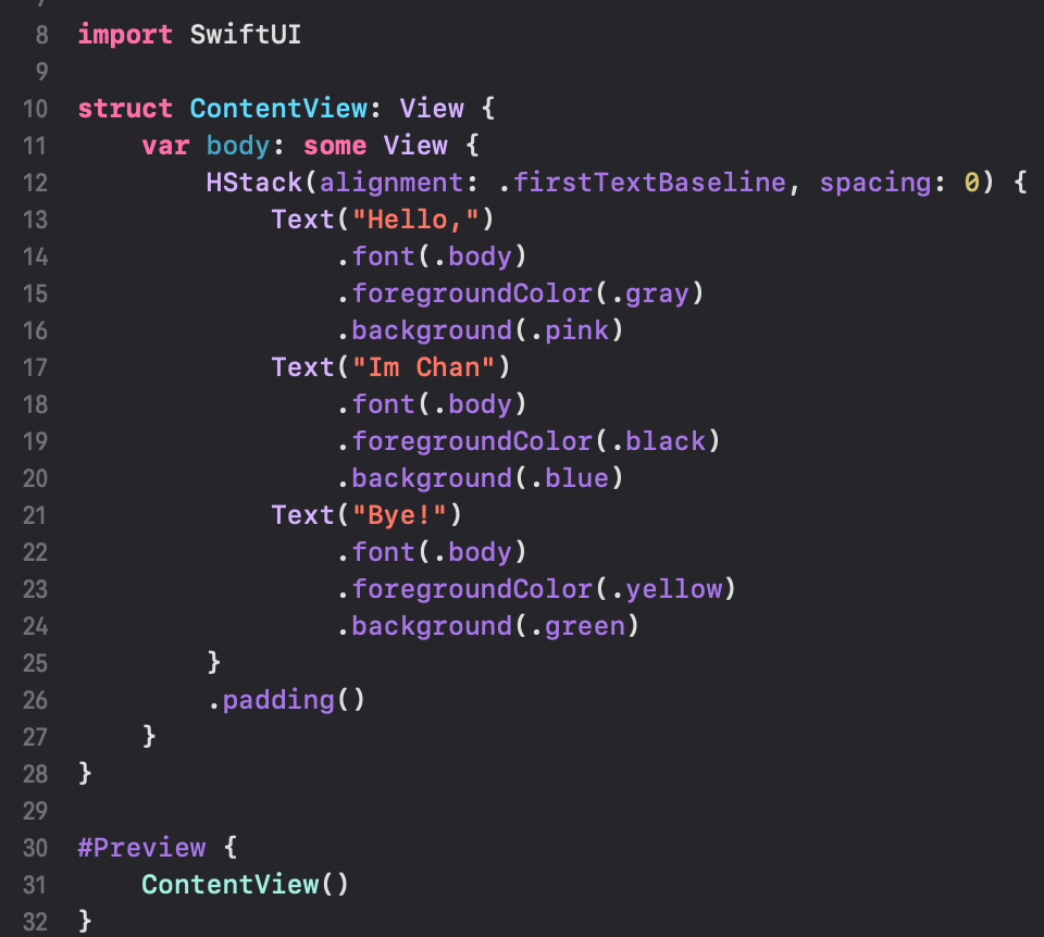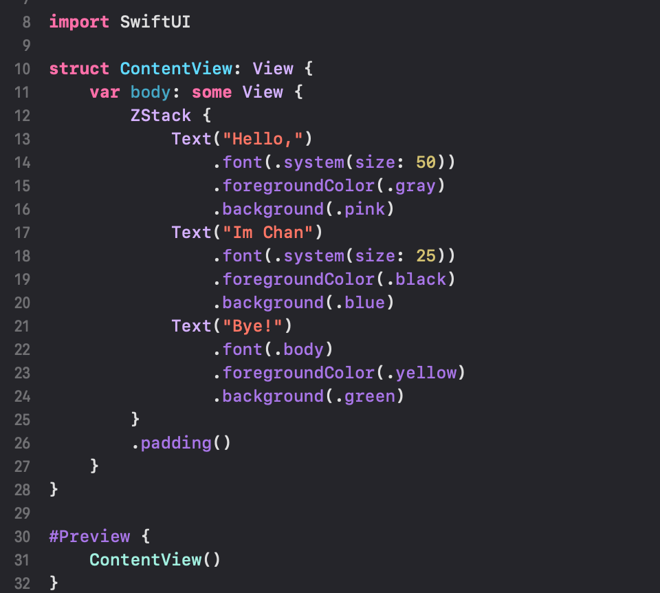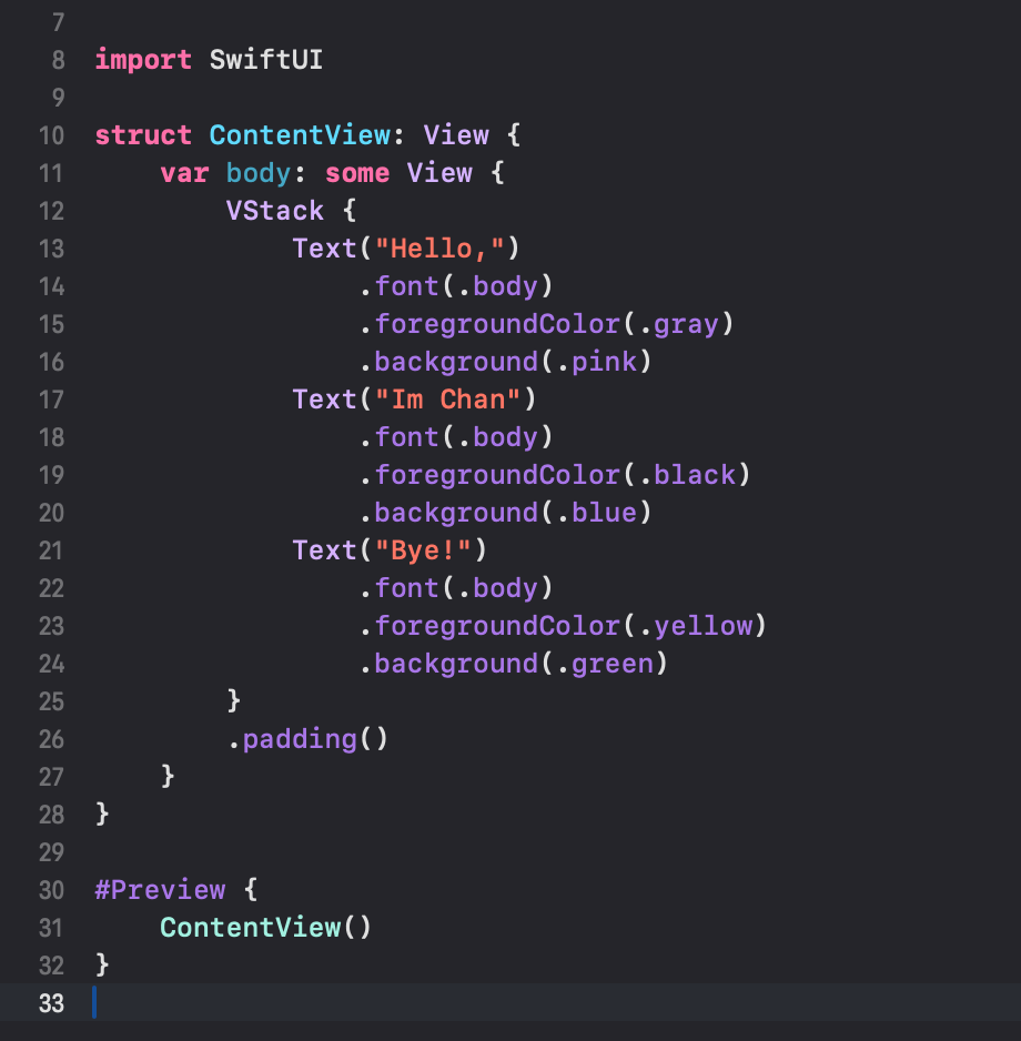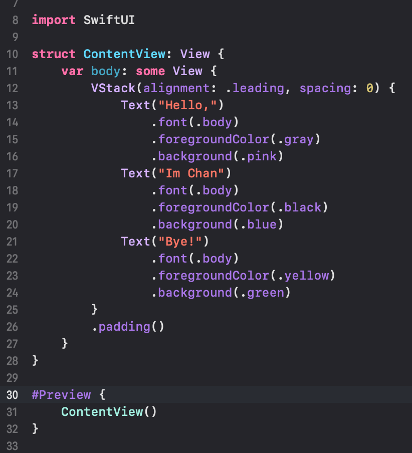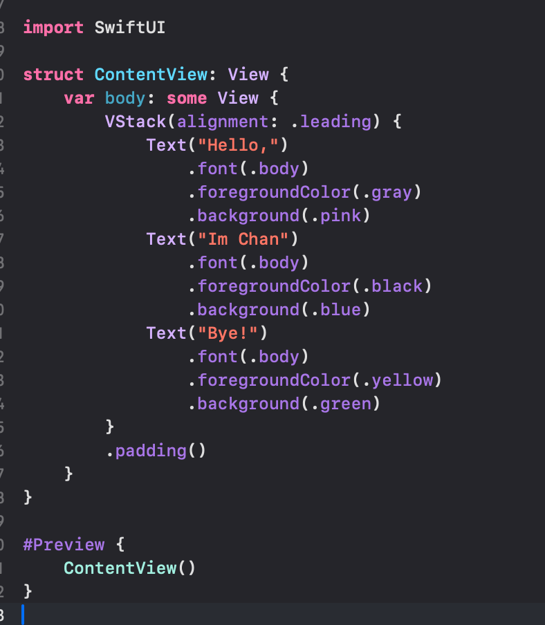 간단하게 VStack 안에 Text View를 위치시켜봤습니다.